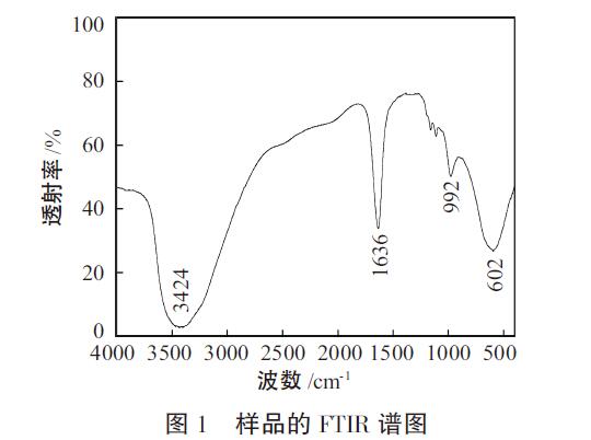 從圖1可以看出,3424cm-1是樣品中與鋁離子相連的-OH基團(tuán)及樣品內(nèi)所吸附的水分子和配位分子中的-OH基團(tuán)伸縮振動產(chǎn)生的。吸收峰面積較大,表明樣品中羥基含量較高。1636cm-1是由結(jié)合水(H-O-H)的彎曲振動引起的吸收峰。992cm-1左右的吸收峰是由Fe-OH-Fe,Al-OH-Al的面內(nèi)伸縮振動峰。602cm-1附近的峰是Al-OH-Al的整體彎曲振動峰。