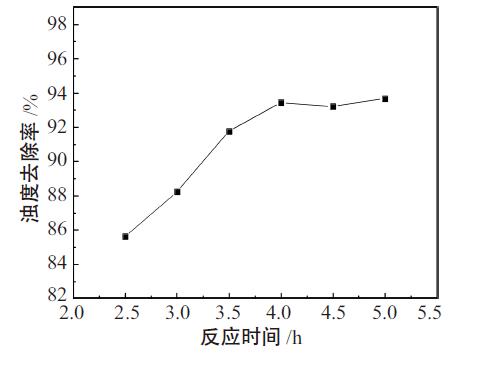 由圖5可以看出,隨著反應(yīng)時間的延長,濁度去除率逐漸增大,產(chǎn)品的絮凝效果顯著提高,反應(yīng)時間為4h時,濁度去除率達(dá)到較大,再繼續(xù)延長反應(yīng)時間,濁度去除率變化不大。這主要是因?yàn)?,反?yīng)時間過短,反應(yīng)體系不能吸收足夠的熱量進(jìn)行水解反應(yīng),進(jìn)而影響聚合反應(yīng),導(dǎo)致產(chǎn)品的聚合度不高。隨著反應(yīng)時間增加,越有利于聚合反應(yīng)的順利進(jìn)行,產(chǎn)品的鹽基度增大,濁度去除率上升。反應(yīng)時間過長,對產(chǎn)品鹽基度增加的貢獻(xiàn)不大,同時浪費(fèi)大量資源,影響生產(chǎn)周期。較后確定較佳反應(yīng)時間為4h。